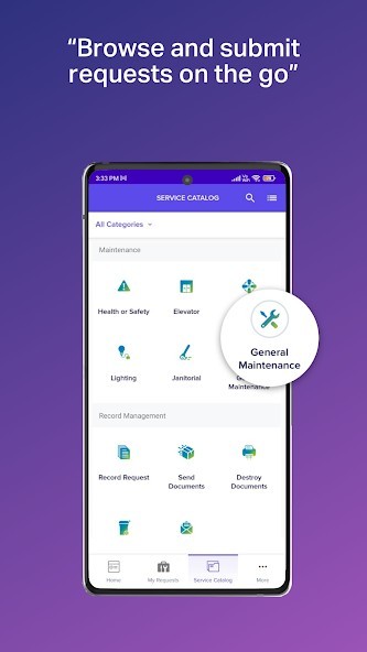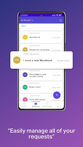 Right from the home screen, take action on crucial updates with action cards and easily submit requests through a catalogue.
