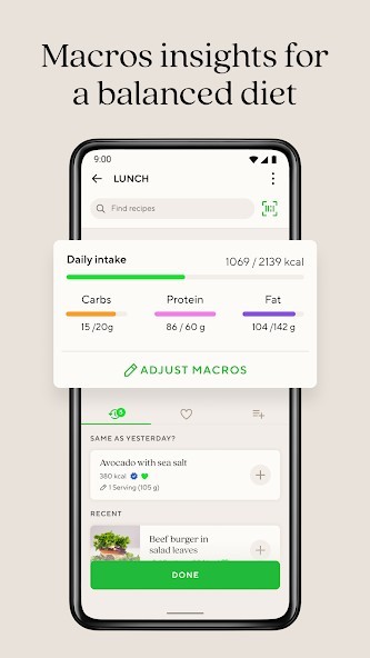 • Macro tracking and adjustable goals for carbs, protein, and fat intake.